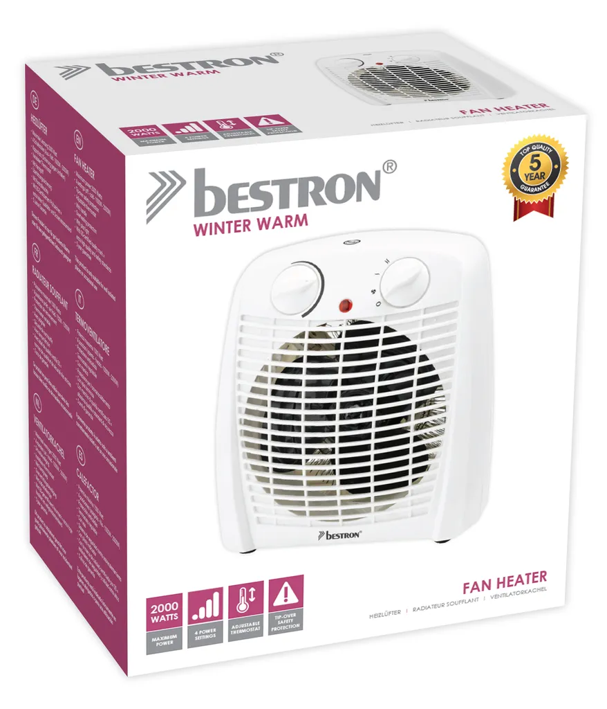 Bestron Heizlüfter Mit 2 Leistungsstufen, Inkl. Umkippsicherung & Überhitzungsschutz, Für Räume Bis Zu 20m², 2000 Watt, Farbe: Weiß