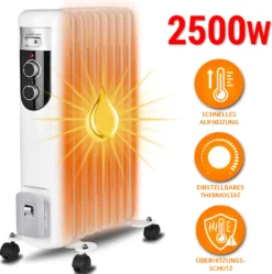 Ölradiator 2500W Lehmann Elektro Heizkörper Mit 11 Rippen Öl Radiator Mobile Elektroheizung Mit Temperaturregelung, Heizung, Heizlüfter, Thermostatregler, Abschaltautomatik, Überhitzungsschutz 2500 Watt, Weiß